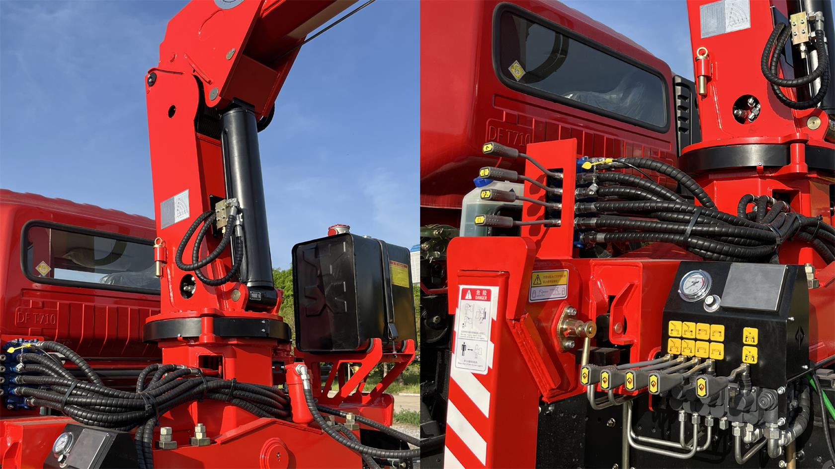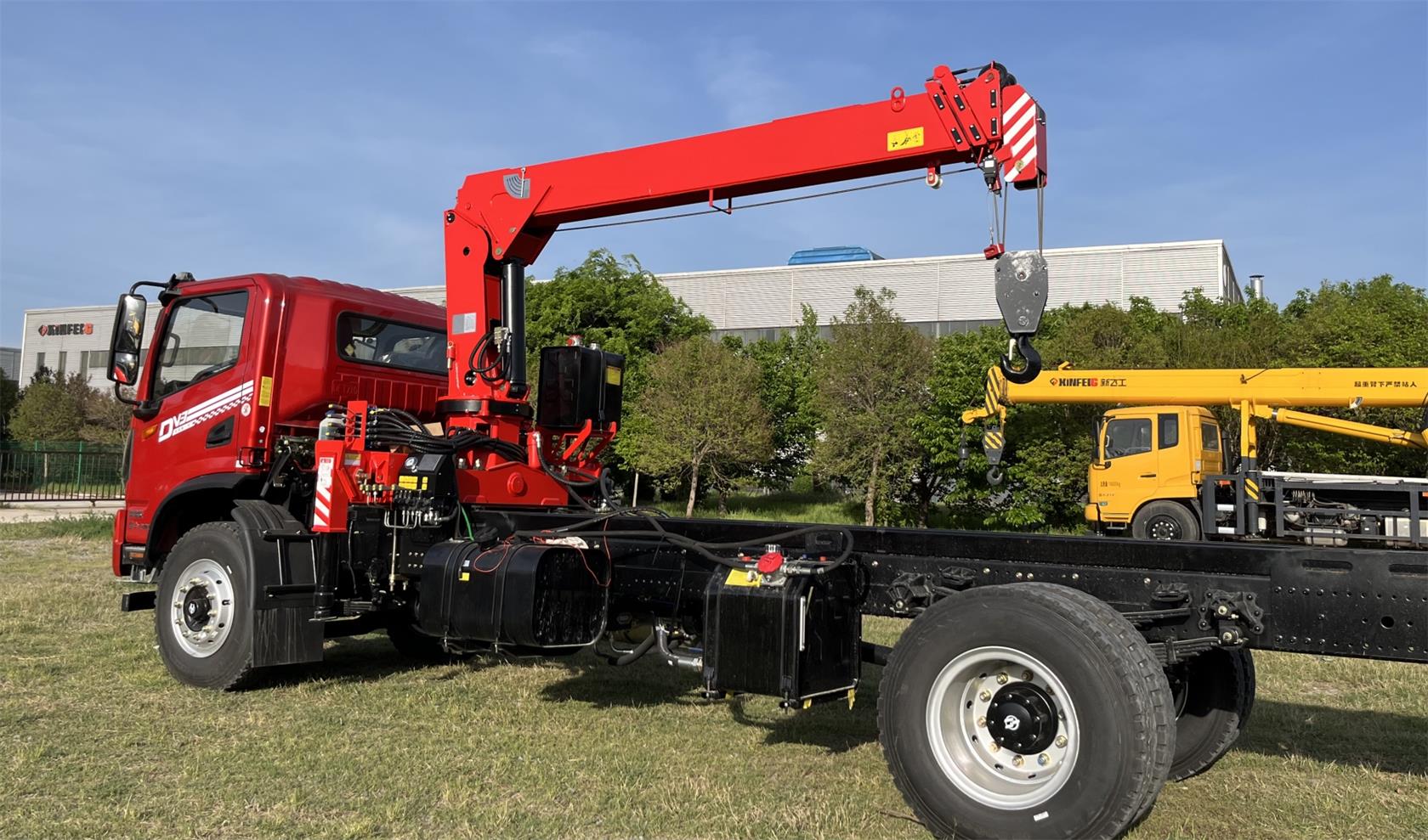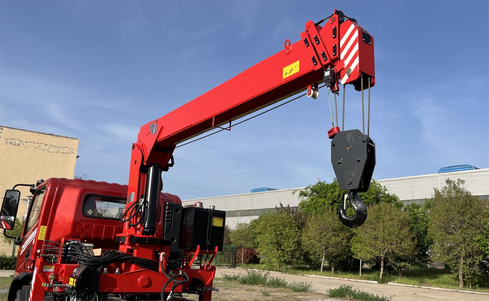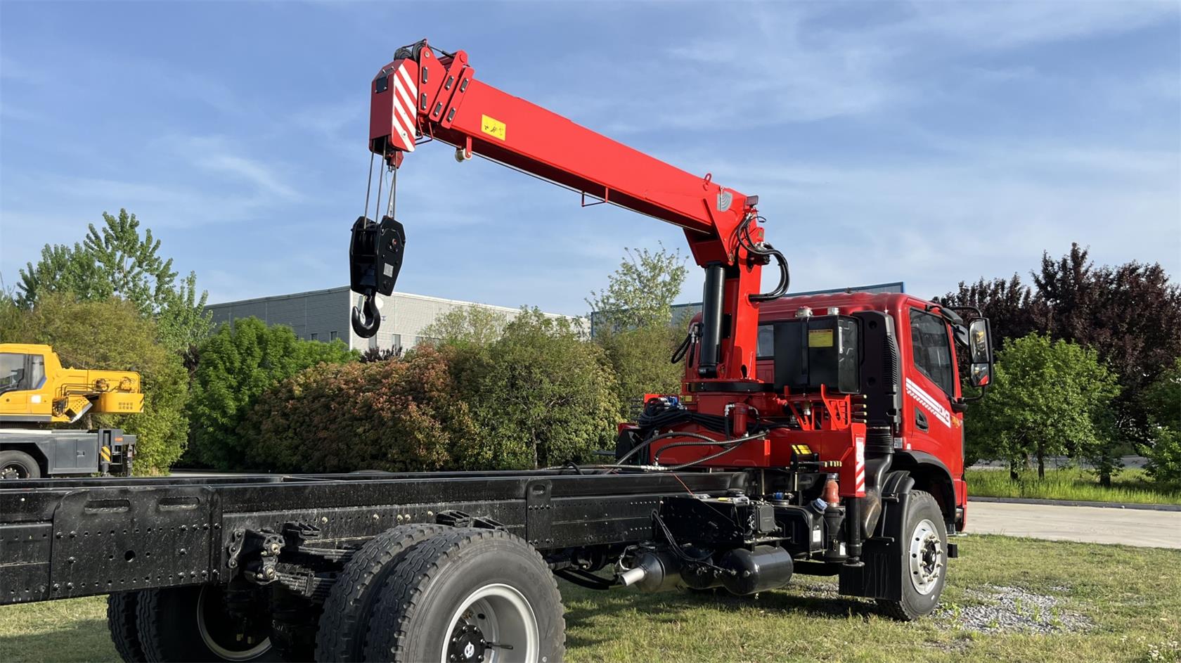 Crane Model: SQS125, hydraulic truck mounted crane, rated lifting capacity 5000Kg, 4-section boom, boom length 11.26 meters, lifting height 13.6 meters, mounted on 4×2 chassis, recommend chassis GVW 5T to 8ton